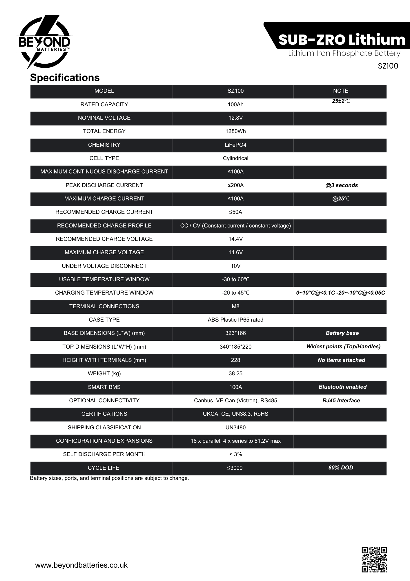 SZ100 - Uses specialised electrolyte formulas to enable ion movement in extreme cold, preventing lithium plating found in standard LiFePO4 cells. Paired with a smart BMS these batteries ensure safe, reliable operation in harsh conditions.